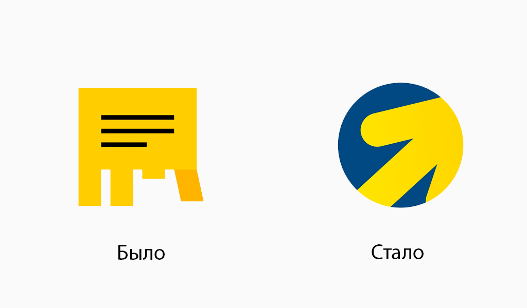 Пример: новый логотип Яндекс.Директа. Знак не только упростился, но и стал многослойным. На нем изображена желтая стрелка на синем фоне. Возникает эффект, будто стрелка представлена не переднем плане.