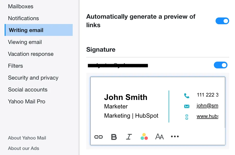 Если у вас несколько учетных записей Yahoo Mail, используйте переключатель, чтобы выбрать учетную запись, для которой вы хотите настроить подпись электронной почты.