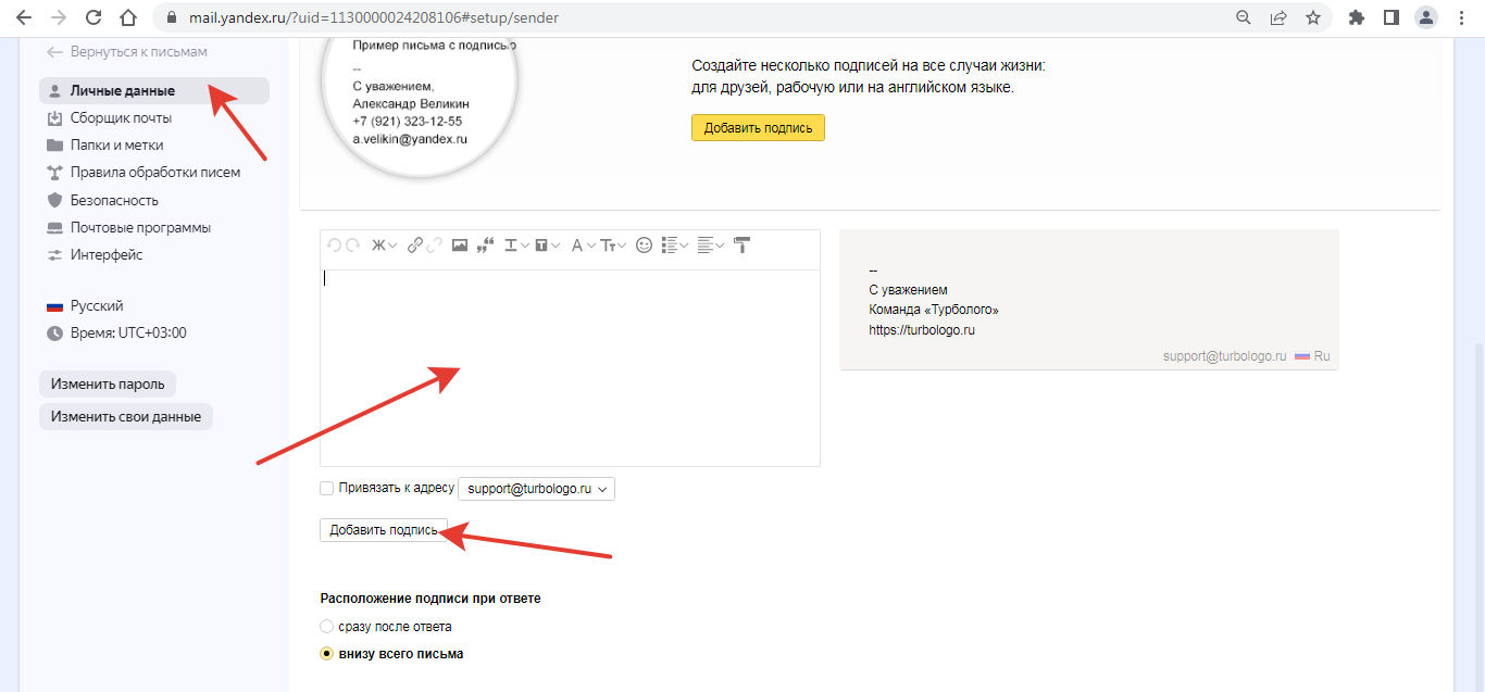 - Нажмите Добавить подпись и вставьте в поле вашу подпись из турболого