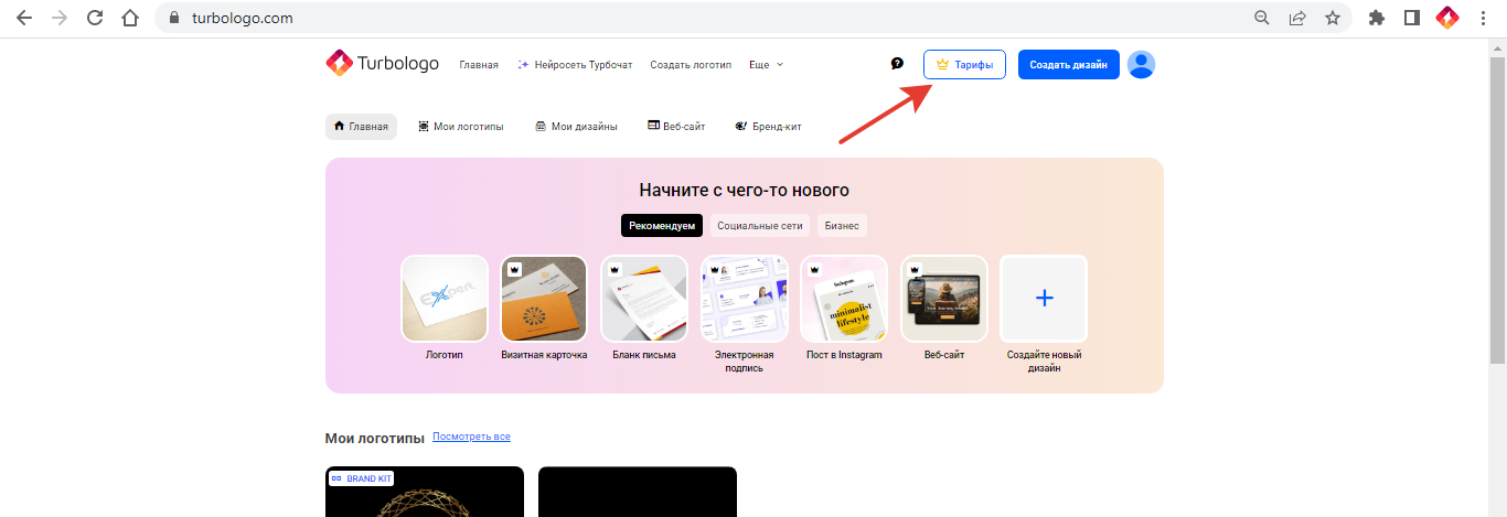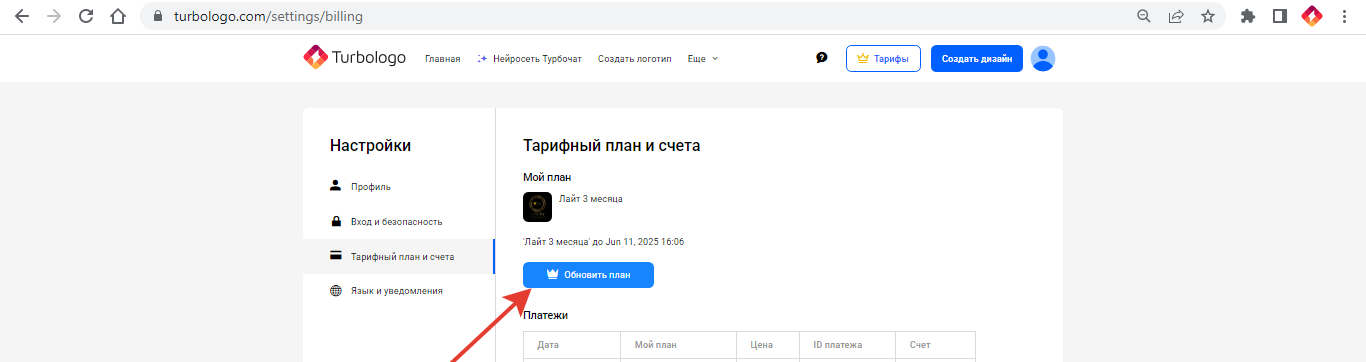 - На странице с логотипом нажать на кнопку тарифы. Так вы можете обновить план до Стандарта или Бизнеса, либо перейти на годовой план.