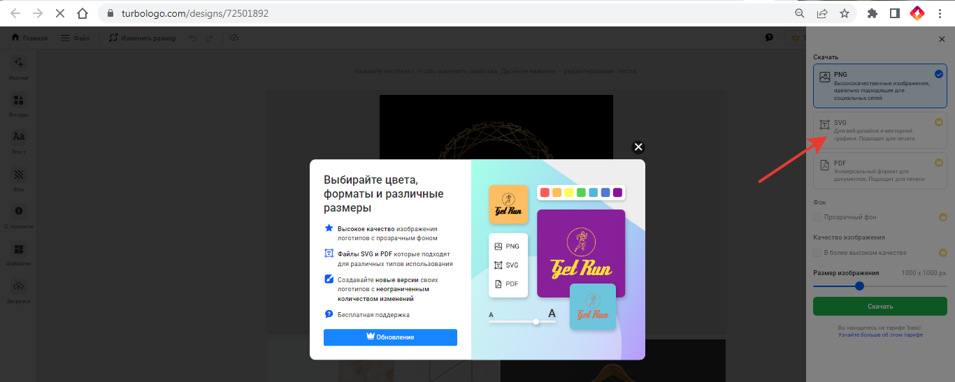 Для того чтобы произвести доплату до стандартного тарифа, вы можете нажать кнопку “Скачать” и в меню выбрать недоступный формат логотипа (SVG, PDF) Чтобы доплатить до тарифа «Бизнес», перейдите на страницу с шаблоном бизнес-материала и нажмите кнопку «Скачать».