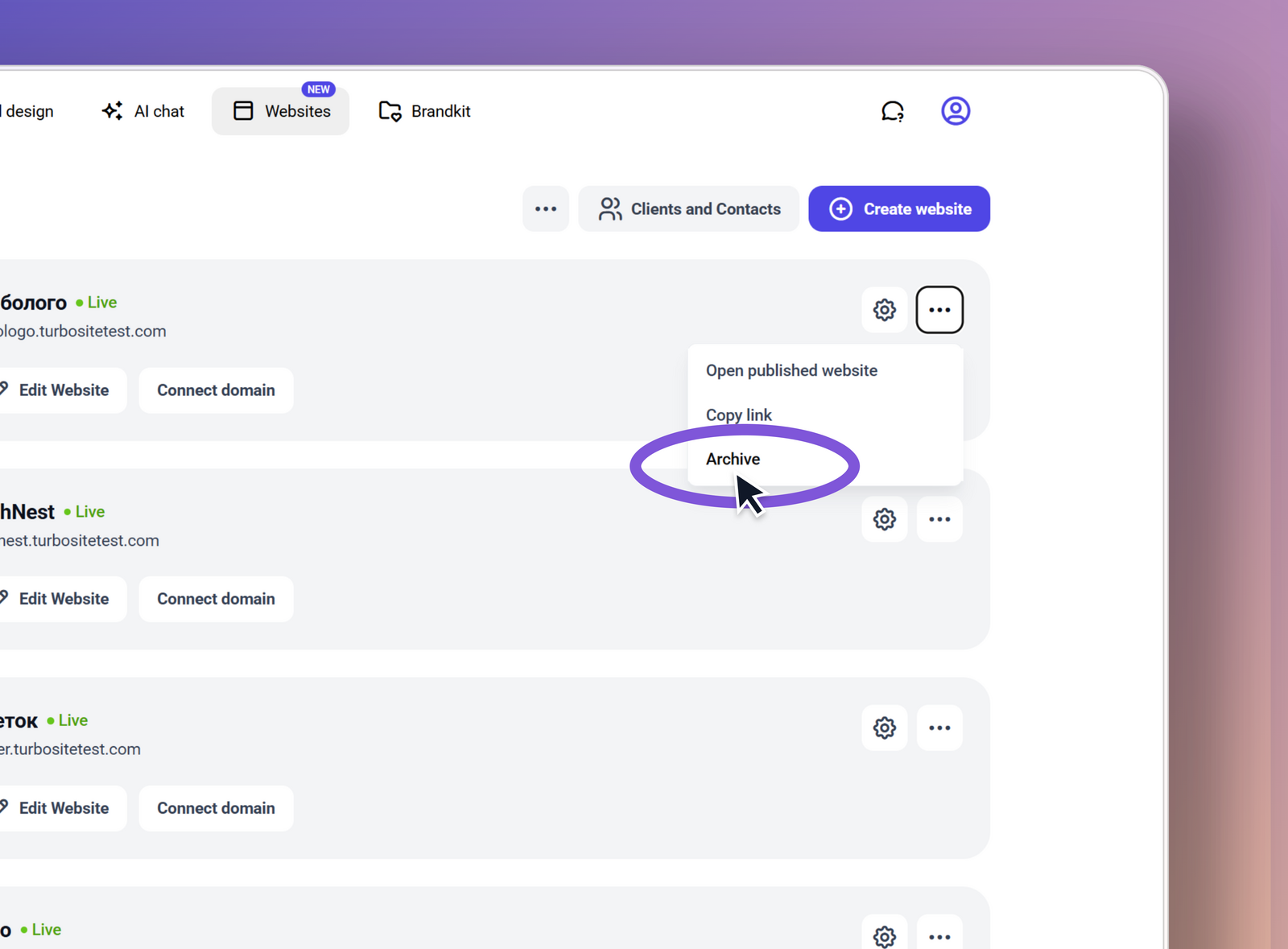 В панели управления сайтами нажмите на три точки рядом с нужным сайтом. В появившемся меню выберите пункт «Удалить».